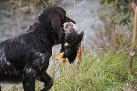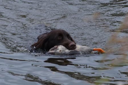 Es ist eine Freude, die gut eingearbeiteeten Hunde bei der Feldarbeit zu beobachten. Sie überzeugen auf der Suche, beim Vorstehen und im Wasser. Dabei lassen sie sich durch nichts aus der Ruhe bringen oder ablenken, nicht durch die Fahrradfahrer in der Ferienregion, nicht durch das Weidevieh, das das Treiben im Feld neugierig bestaunt. Zügig kommen wir voran, so dass alle Gruppen am Freitag mit der Feldarbeit fertig werden.Zum Glück, denn für Samstag ist schlechtes Wetter angesagt. Trotz teilweise hervorragender Anlagen können vier Gespanne leider nicht bestehen. Drei Hunde scheitern bei der Schleppenarbeit, ein Hund beim Verlorenbringen im Wasser, schade.
