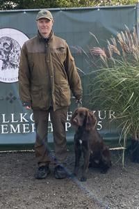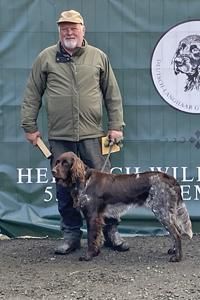 Leichterer Rüde des Mittelschlages mit passenden Proportionen. Flüssiger Bewegungsablauf in allen Gangarten, Vorderläufe korrekt gewinkelt und gestellt, Hinterläufe etwas zeheneng, aber korrekt gewinkelt, sehr gute Brustbreite und Brusttiefe. Sehr gut pigmentiertes, eng anliegendes Gebrauchshaar, der Jahreszeit entsprechend.