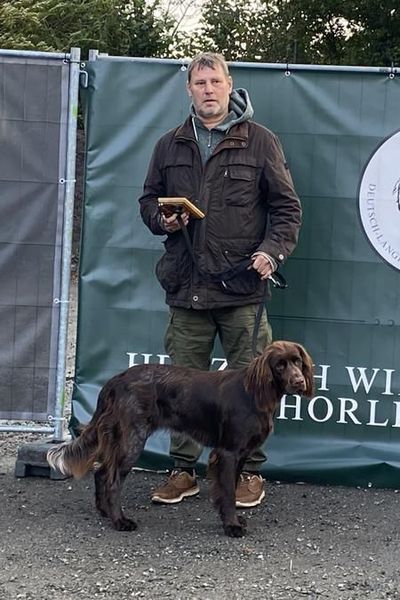 Kompakter Rüde des Mittelschlages mit passenden Proportionen, ausdrucksvollem Rüdenkopf und gut angesetzten Behängen. Flüssiger, raumgreifender Bewegungsablauf in allen drei Gangarten, sehr gute Brustbreite und Brusttiefe, korrekte Winkelung und Stellung der Läufe, ausgezeichnet bemuskelter, gerader Rücken, korrekt angesetzte und getragene Rute. Eng anliegendes, sehr gut pigmentiertes Gebrauchshaar, der Jahreszeit entsprechend.