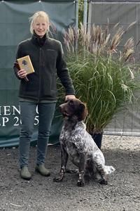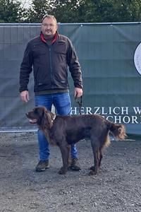 Sehr typvolle, substanzvolle Hündin mit edlem Hündinnenkopf. Gerader, fester, gut bemuskelter Rücken, flüssiger, raumgreifender Bewegungsablauf, gut angesetzte Rute. Dichtes, sehr gut pigmentiertes Gebrauchshaar, am Rücken leicht wellig.