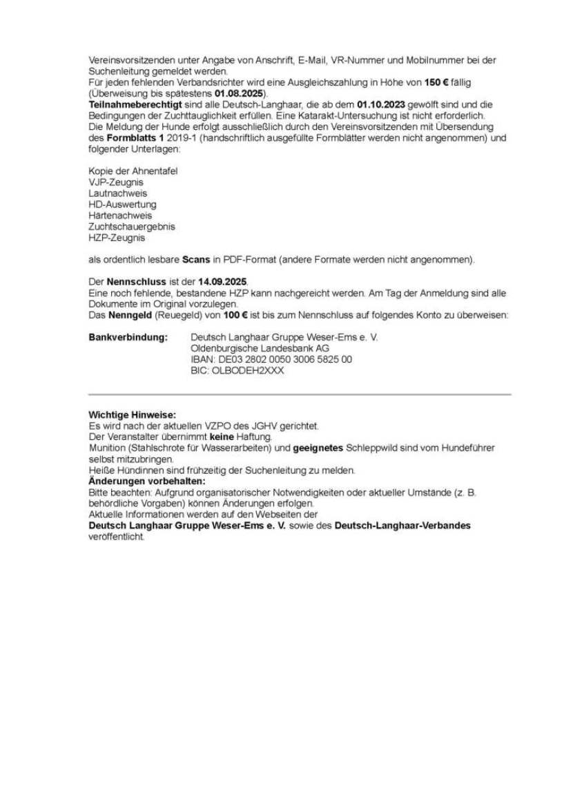.Wichtig: Der Eigentümer des gemeldeten Hundes muss einem dem JGHV Deutschland angeschlossenen Verein angehören. Dieser muss auf dem Nennformular benannt sein.